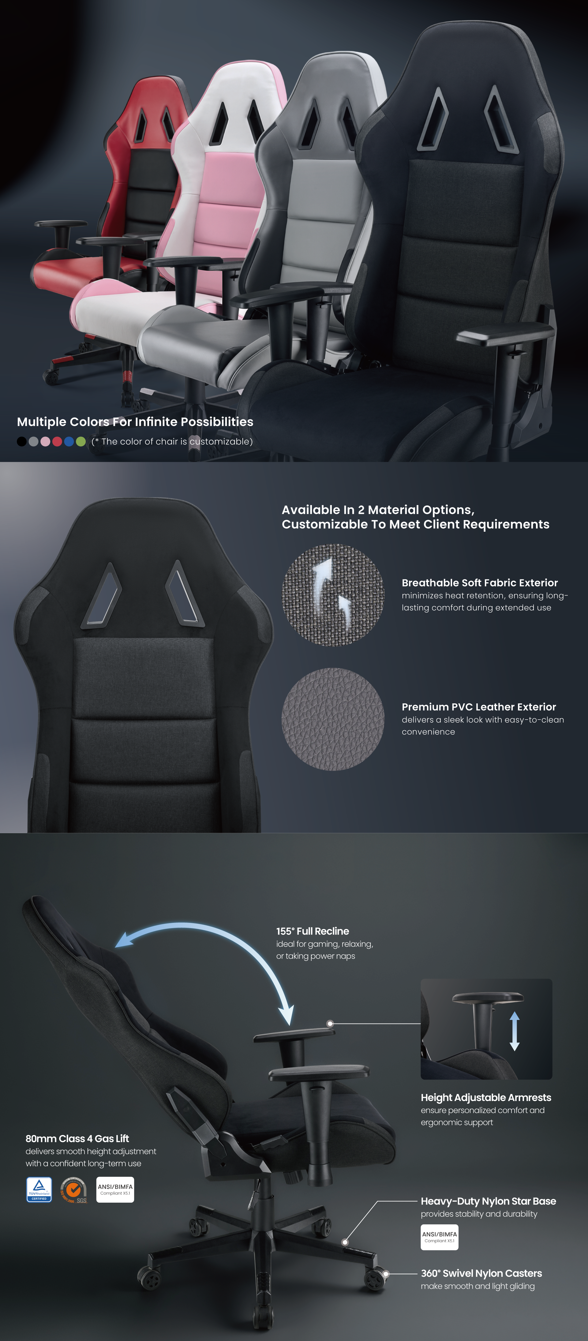 Designed with both functionality and aesthetics in mind, the CH09-19 offers two material options: breathable soft fabric that reduces heat buildup for long-lasting comfort, or premium PVC leather that delivers a sleek look and easy-to-clean convenience. Height-adjustable armrests provide ergonomic support tailored to individual needs, enhancing both comfort and productivity. A heavy-duty nylon star base ensures superior stability and durability, while smooth 360° swivel nylon casters allow effortless movement across various surfaces. Multiple color and material choices enable customization to meet diverse client preferences and interior design styles.