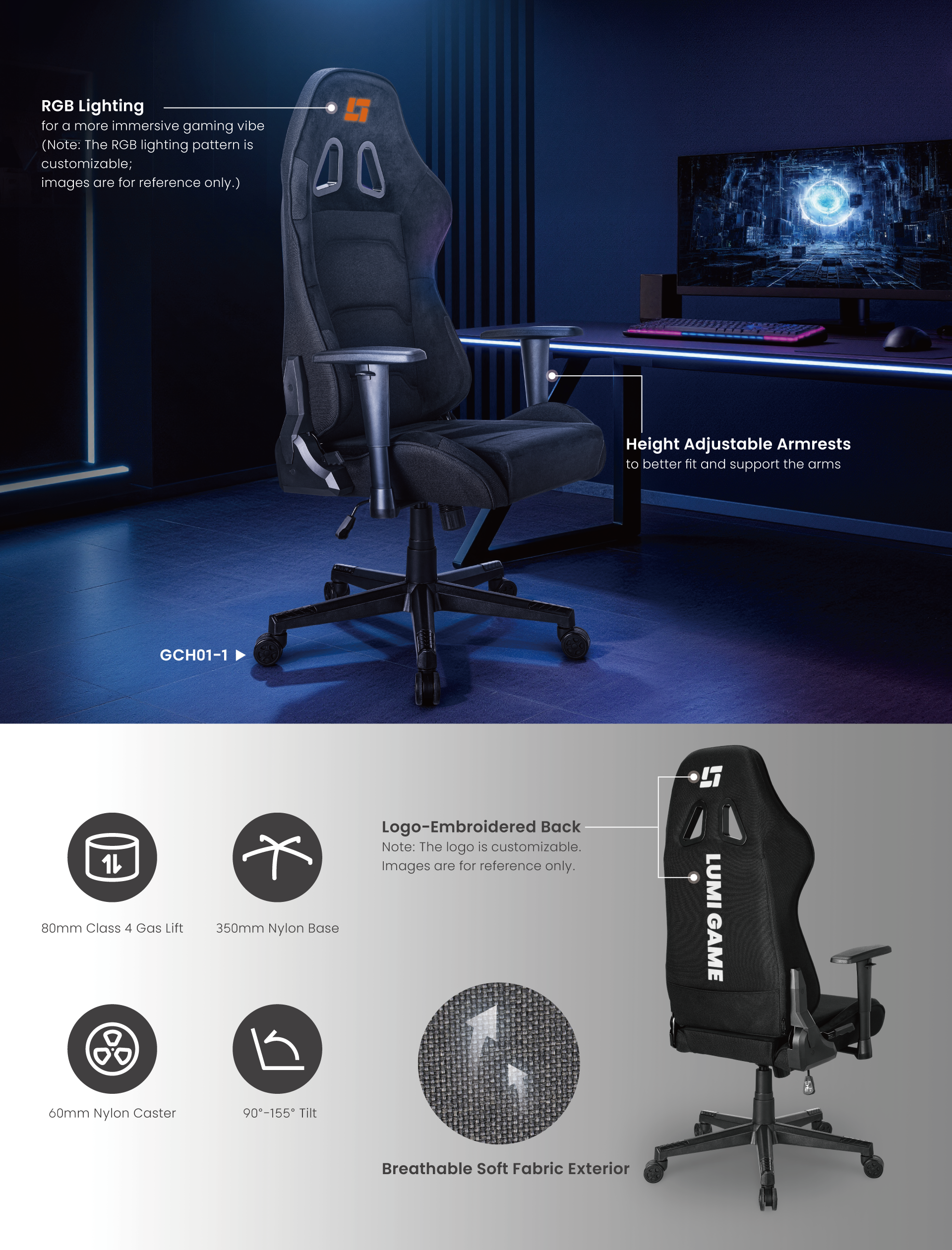 The GCH01-1 gaming chair combines premium comfort with robust support, featuring a metal frame, soft knitted fabric with velvet accents, and a wide 155° recline. Designed for durability, it supports up to 150kg on a stable nylon base with smooth-rolling casters. Customizable RGB and embroidered logos on the back add a personalized touch to your setup.