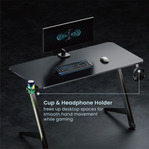 - Under-Desk headphone & cup holders create a clutter-free desktop.