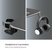 - Under-Desk headphone & cup holders create a clutter-free desktop.