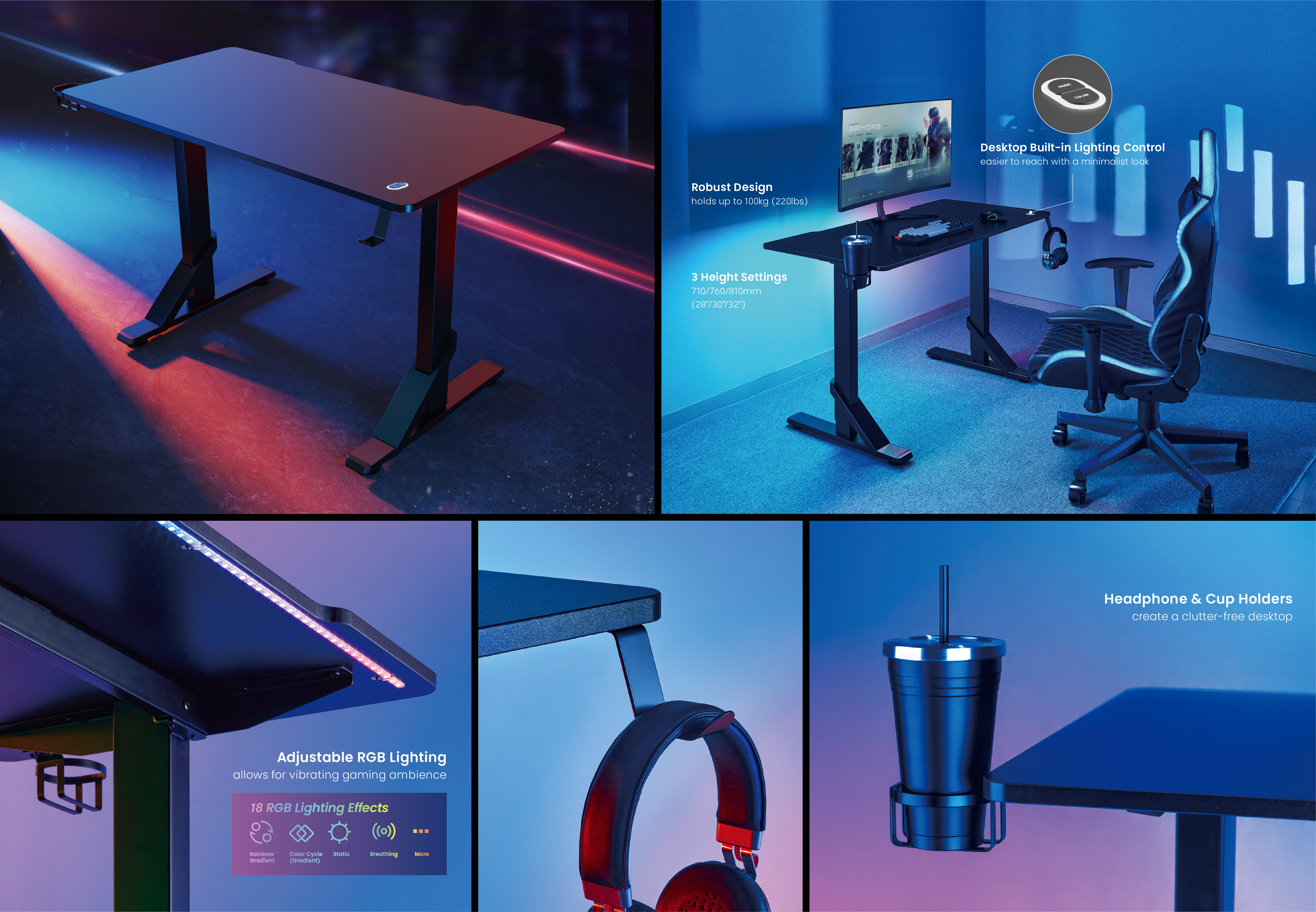 The GMD11-03 Large Heavy-Duty Gaming Desk features a 100kg (220lbs) load capacity, which is adequate for regular gaming applications. The easily button-controlled RGB lighting enables various backlight modes for a vibrating gaming ambiance. Cup and headphone holders are also available for a clutter-free desktop. 3-height settings (710/760/810mm) allow for better viewing angles for different gamers, providing an easy and healthy gaming experience.