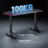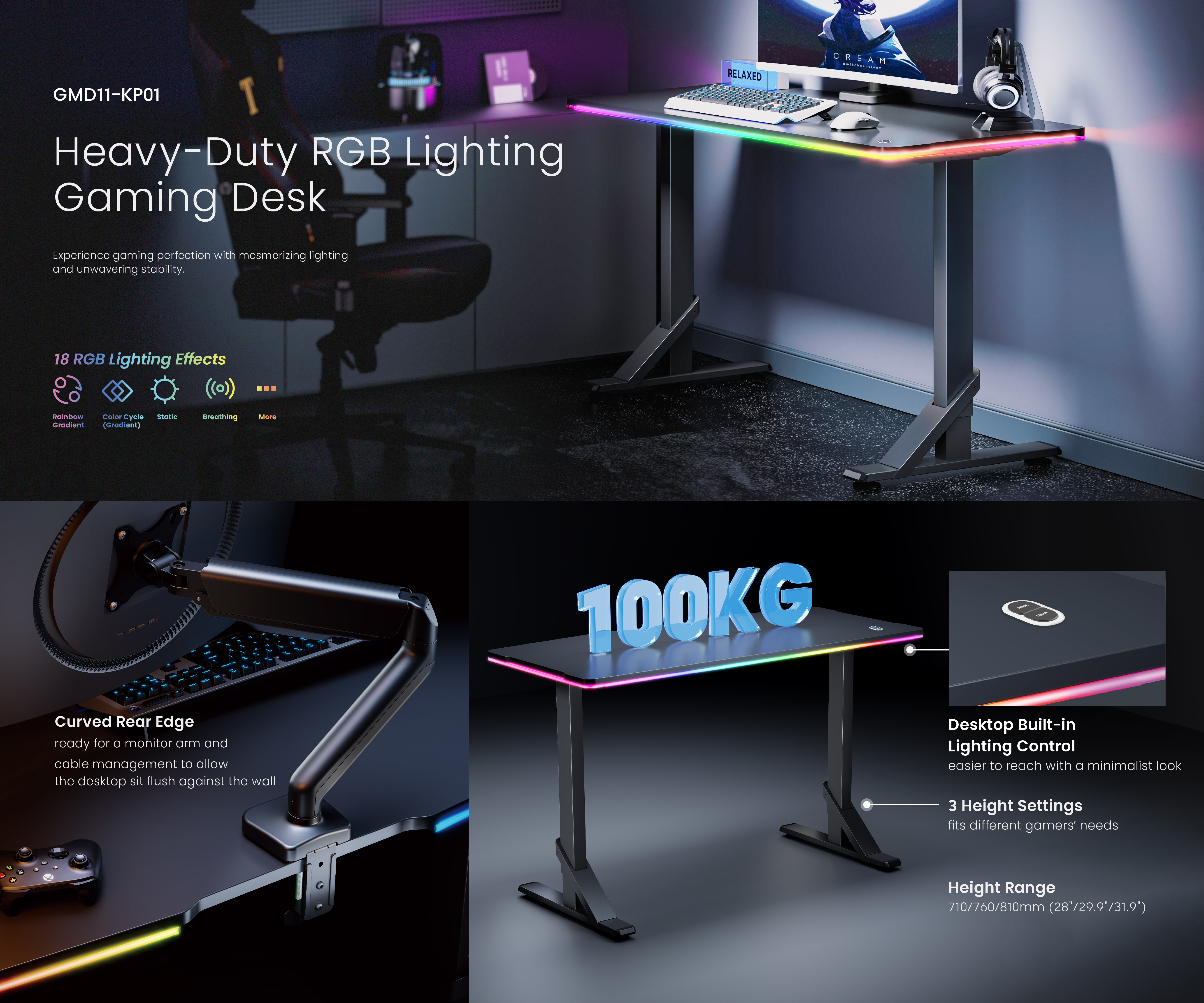 Experience gaming perfection with mesmerizing lighting and unwavering stability. GMD11-KP01 with a robust 100kg (220lbs) weight capacity is built for heavy-duty gaming setups. Immerse in the gaming ambiance with the vibrant RGB lighting strip offering 20 dazzling effects. For a healthier and more personalized gaming experience, achieve the perfect ergonomic setup with its 3-level height (710/760/810mm) adjustability.