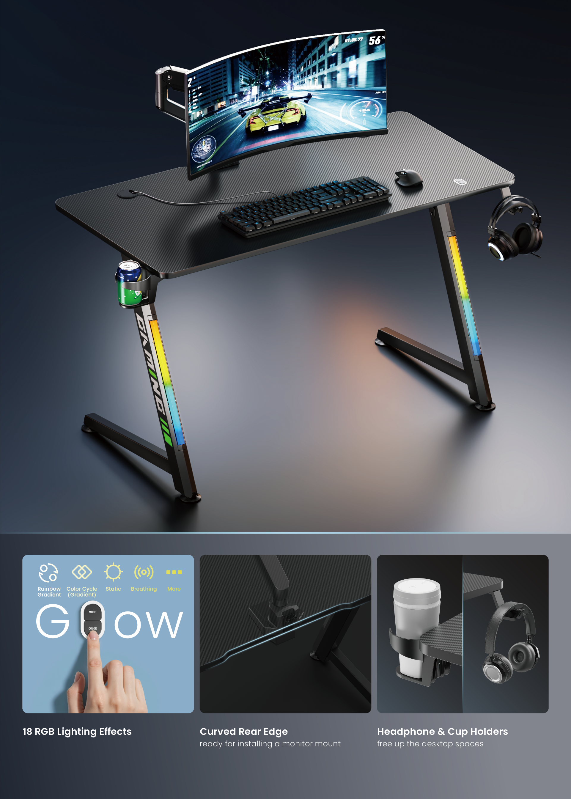 Sleek and reliable, the GMD16-1 gaming desk features 18 RGB lighting effects for an immersive experience. Cable management slots ensure a clean and organized workspace, making it the perfect companion for any gaming setup.