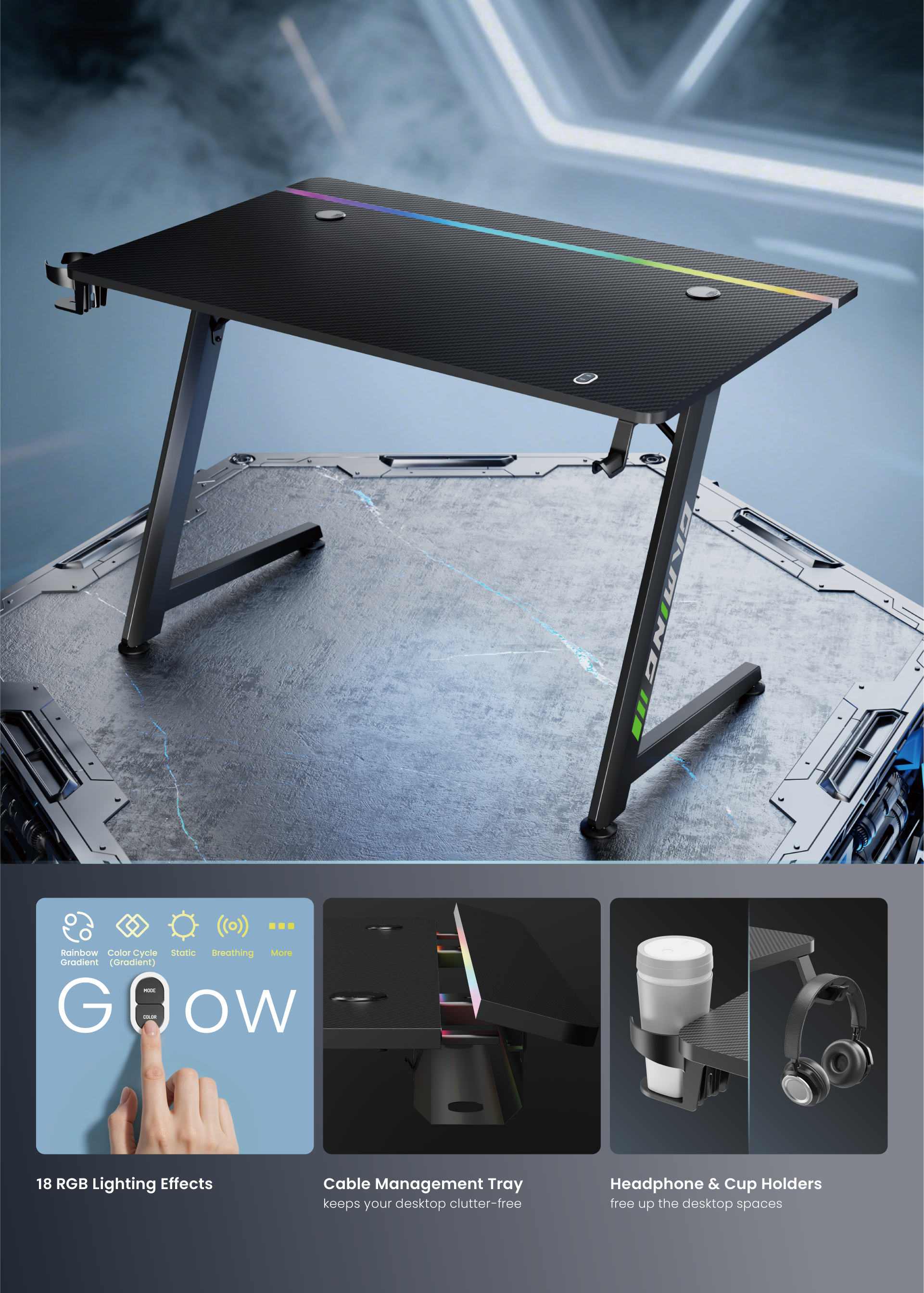 Sleek and reliable, the GMD16-3 gaming desk features 18 RGB lighting effects for an immersive experience. Cable management tray and slots ensure a clean, organized workspace, making it the perfect companion for any gaming setup.