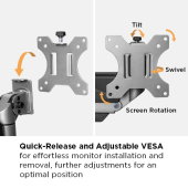 LDA39-1112 Gas Spring Monitor Wall Mount is an excellent choice for wall mounting a computer monitor. Able to hold and easily position monitors from 17-35” weighing up to 15kg/33lbs! A quality gas spring mechanism provides perfect balance for ultimate maneuverability. The quick release VESA plate makes monitor installation or removal easy and quick.