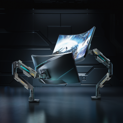 This monitor arm stands out with a futuristic, industrial design, featuring sharp lines and bold color contrasts. The exposed gas spring mechanism adds a high-tech vibe. Its sleek form integrates seamlessly into modern spaces, offering a perfect blend of functionality and visual impact. Designed for effortless adjustability, it ensures precision and style in any setup.