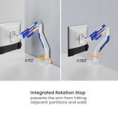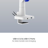This monitor arm stands out with a futuristic, industrial design, featuring sharp lines and bold color contrasts. The exposed gas spring mechanism adds a high-tech vibe. Its sleek form integrates seamlessly into modern spaces, offering a perfect blend of functionality and visual impact. Designed for effortless adjustability, it ensures precision and style in any setup. Smart base with USB-A & USB-C ports supports charging and data transfer for enhanced gaming experience.