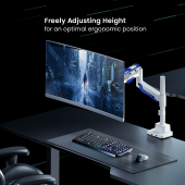 This monitor arm stands out with a futuristic, industrial design, featuring sharp lines and bold color contrasts. The exposed gas spring mechanism adds a high-tech vibe. Its sleek form integrates seamlessly into modern spaces, offering a perfect blend of functionality and visual impact. Designed for effortless adjustability, it ensures precision and style in any setup. Smart base with USB-A & USB-C ports supports charging and data transfer for enhanced gaming experience.