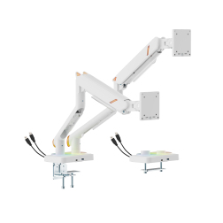 Feel the energy flow in orange. The LDT111-C012UCL delivers stable support for monitors up to 20 kg (44 lbs) while remaining economically priced. Its orange-accented design brings both style and a lively, dynamic experience to your workspace. The monitor arm features a quick release VESA plate and joints for easy installation and removal, a built-in spring tension mechanism for precise weight adjustment, a smart base with USB-A & USB-C ports for data transfer and charging, and a RGB mode button offering 16 lighting modes to create a personalized ambience. It combines vibrant design with reliable strength for a flexible and dynamic workspace.