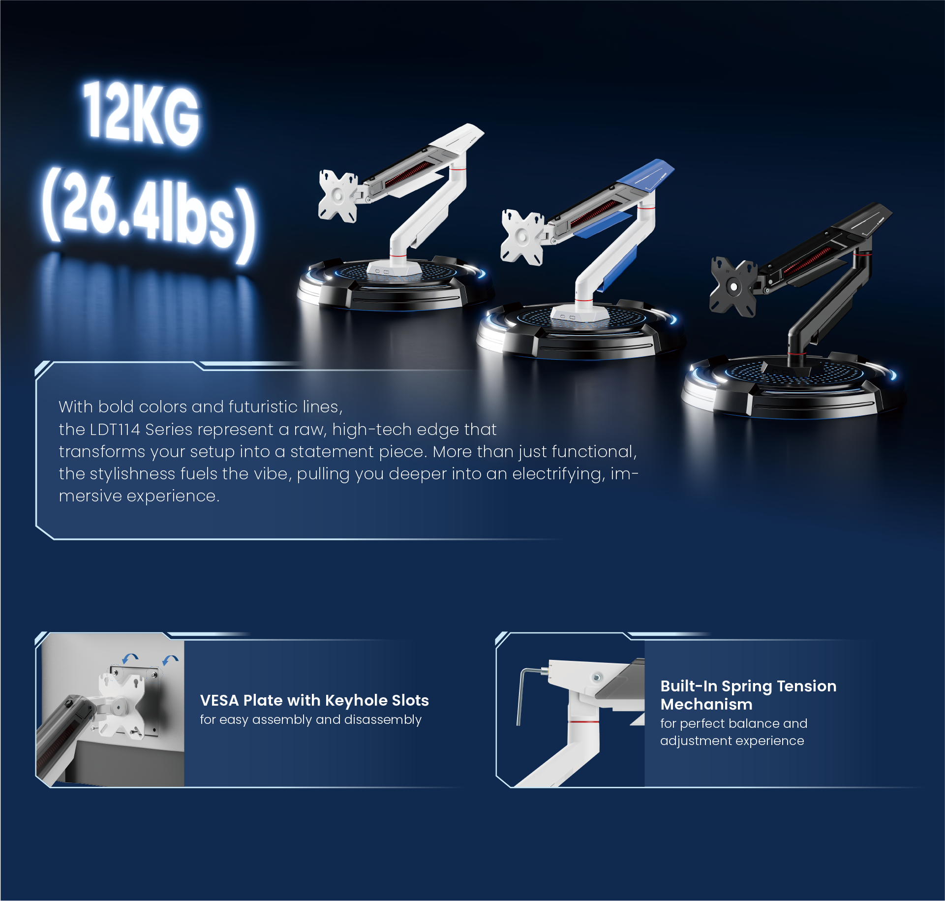 Designed for gaming, the LDT114-C012 brings style and performance together. With bold color options and futuristic shapes, an advanced gameplay vibe is created for stronger immersion. Full flexibility—tilt, swivel, and rotation—polishes every angle for optimized viewing, while the built-in spring tension mechanism ensures smooth, effortless adjustments. A keyhole-patterned VESA plate makes setup and disassembly effortless. Powerful, versatile, and stylish—the LDT114-C012 is hence built to elevate your setup.