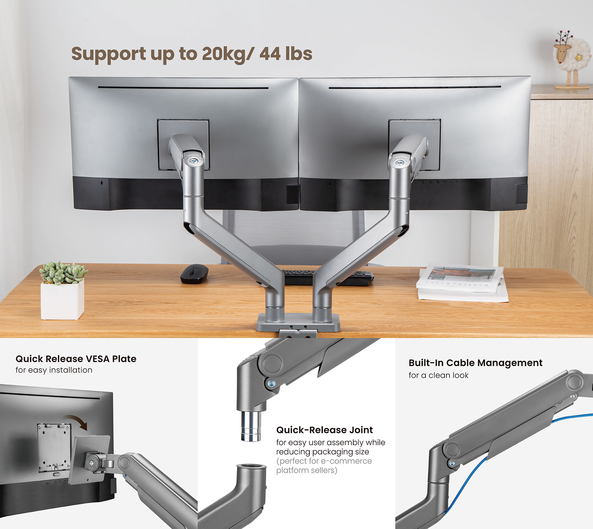 The LDT74-C024 is equipped with quality springs, and offers effortless height adjustment, tilt, and swivel capabilities, allowing the user to find the perfect ergonomic position for the monitor. Say goodbye to neck and back strain and enjoy the flexibility to customize the viewing experience. Constructed with durable materials and a sturdy design, the monitor arm can securely hold even the heaviest monitors up to 20kg/44Ibs, providing stability and peace of mind. Lifting the monitor off the desk surface gains valuable space to organize essentials and create a more streamlined and efficient environment. Experience the ideal combination of cost-effectiveness, durability, and ergonomic functionality with the Economical Heavy-Duty Spring-Assisted Monitor Arm.
