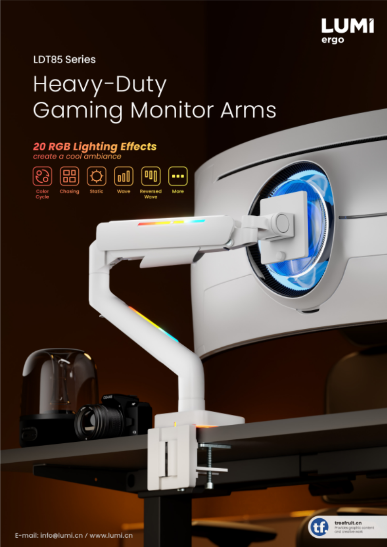 The LDT85-C024L RGB Gaming Dual Monitor Arm features a quick-release VESA plate for effortless setup, an optimized tilting structure for smooth adjustments, and built-in button control for customizable lighting modes. Its cool lighting effect seamlessly blends into any gaming station, while cable management ensures a neat look. Plus, it supports curved monitors, offering flexible positioning for immersive gaming.