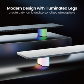 The monitor riser with illuminated legs seamlessly blends contemporary style with practical functionality. With a hidden lighting control wheel, it offers customizable lighting with three modes: 6-color rainbow gradient mode, 7-color static mode, and 6-color breathing mode. This riser not only raises the monitor for ergonomic comfort, but also enhances the space with adjustable, dynamic lighting. The minimalist design provides a sophisticated touch while maintaining an uncluttered, modern look.