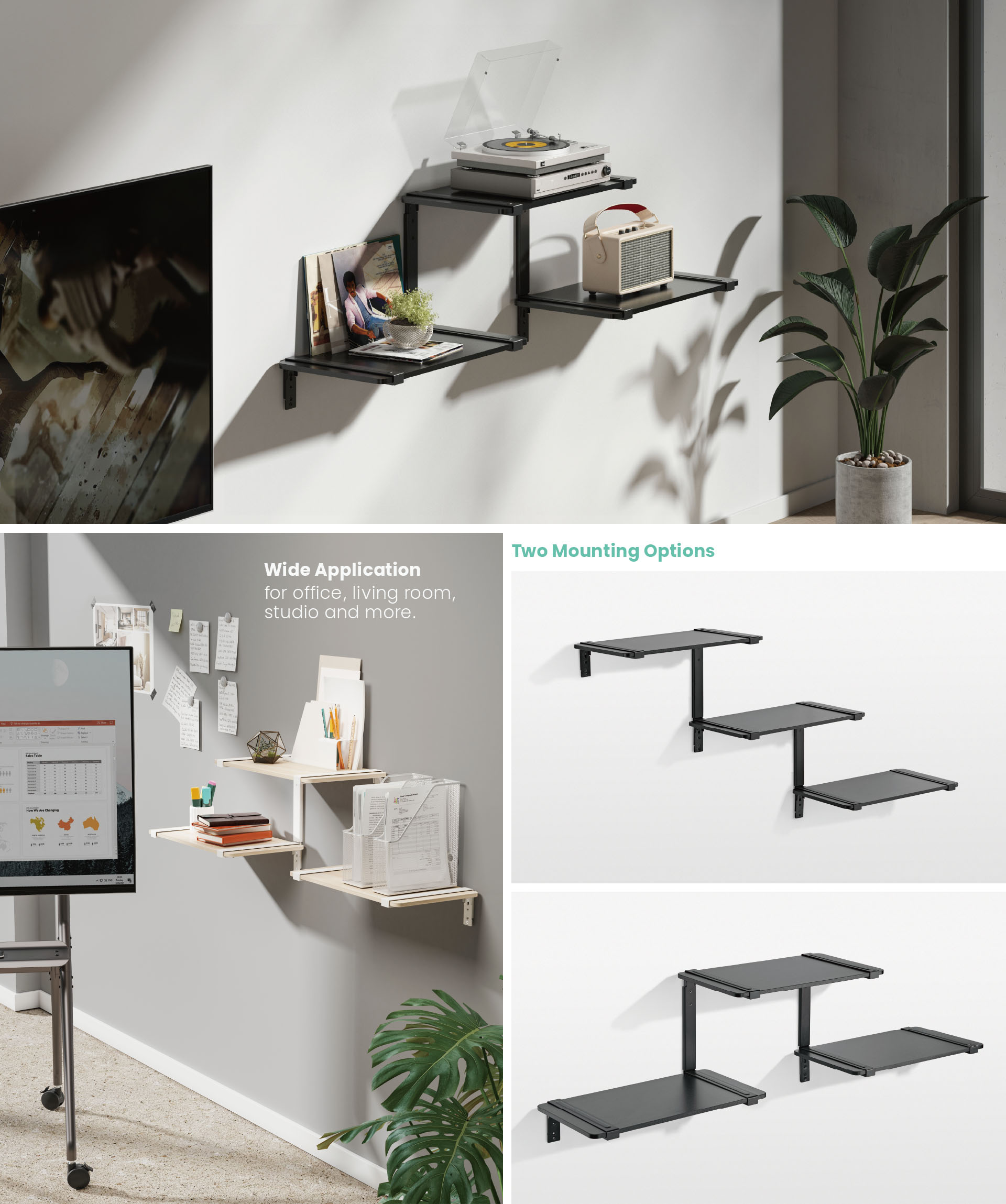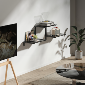 Featuring a floating design, the FLS-01 Modular Media Shelves is a space-saving storage solution for TV peripherals without taking up floor space. The 3-tier shelves provide ample room for supporting up to 10kg (22lbs) devices per layer. Perfect for DVD players, CDs, records, game consoles and other TV components. Customizable modular design allows the user to change the shelf layout freely to fit different needs freely. They come in black and white–meeting the needs for different interior design.