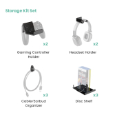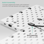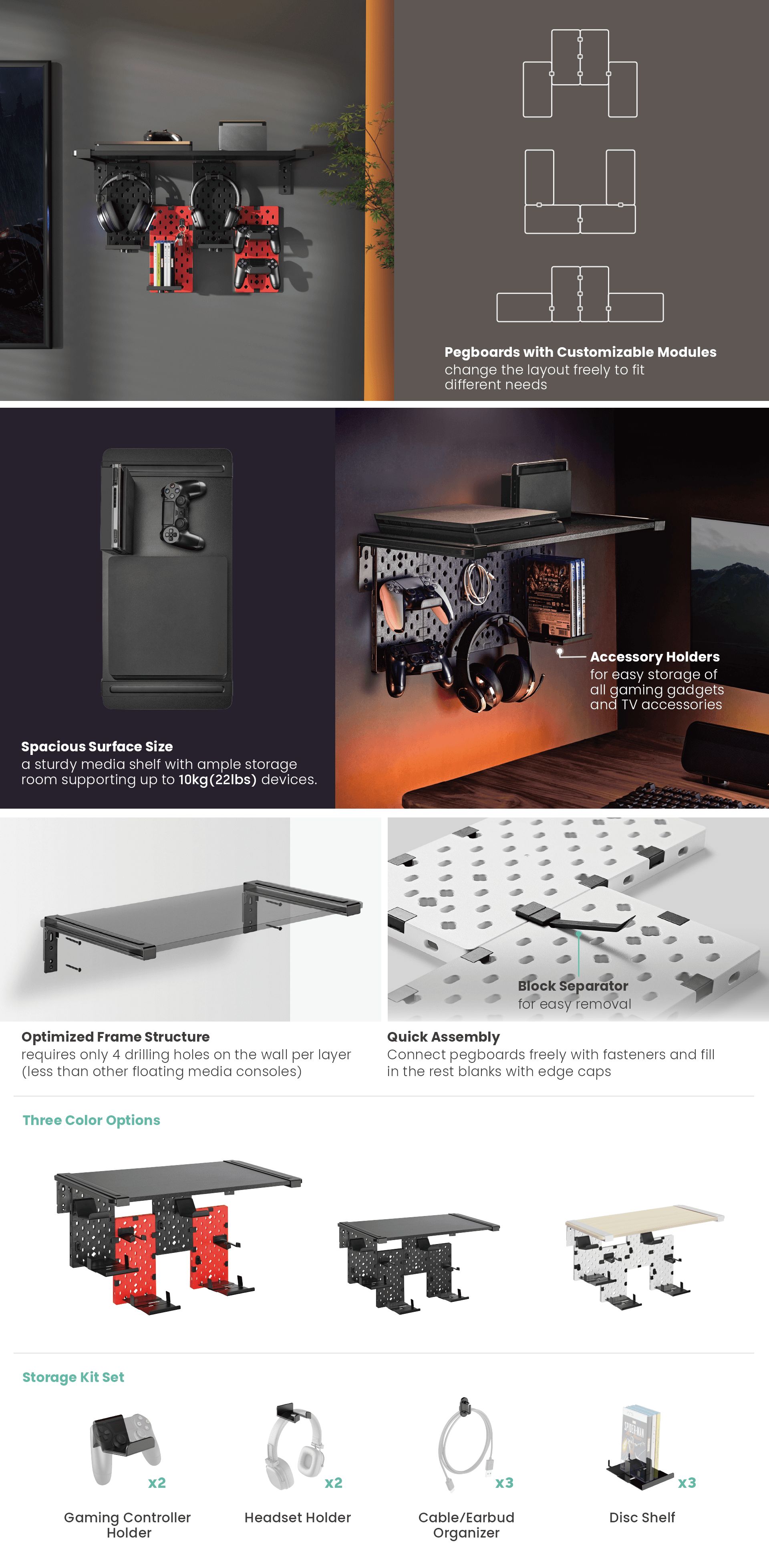 Personalize TV accessories and gaming gadgets display. The spacious media shelf provides ample room for supporting up to 10kg (22lbs) devices. A variety of storage kits are included for storing controllers, headphones, cables, and game discs. Customizable modular design allows the user to freely change the pegboard layout to fit different needs. They come in three color options – meeting the needs for different interior design.
