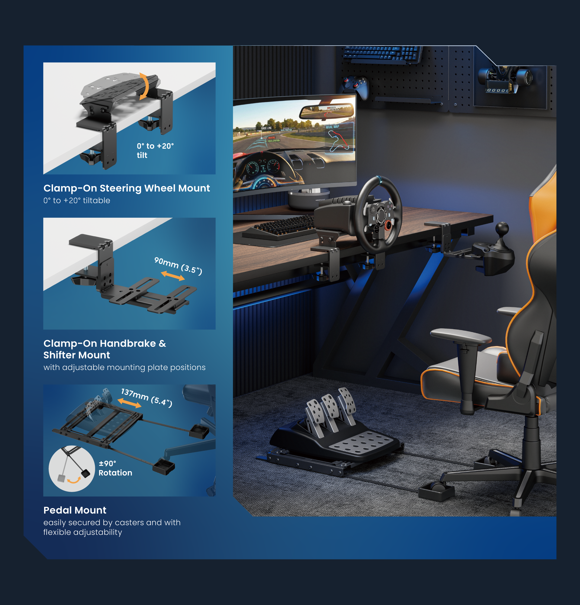 The LRA04-BS01 stands for a complete system engineered for racing gears, featuring a steering wheel mount with smooth tilting adjustability for ideal driving posture, a handbrake & shifter mount with adjustable mounting plate positions for perfect gear placement, and a pedal mount secured by chair casters and offering flexible adjustments to match multiple racing styles. Fitting gears from most popular brands, the LRA04-BS01 combines universal compatibility with user-friendly adjustability—offering a solid, customizable cockpit foundation for immersive racing experiences.