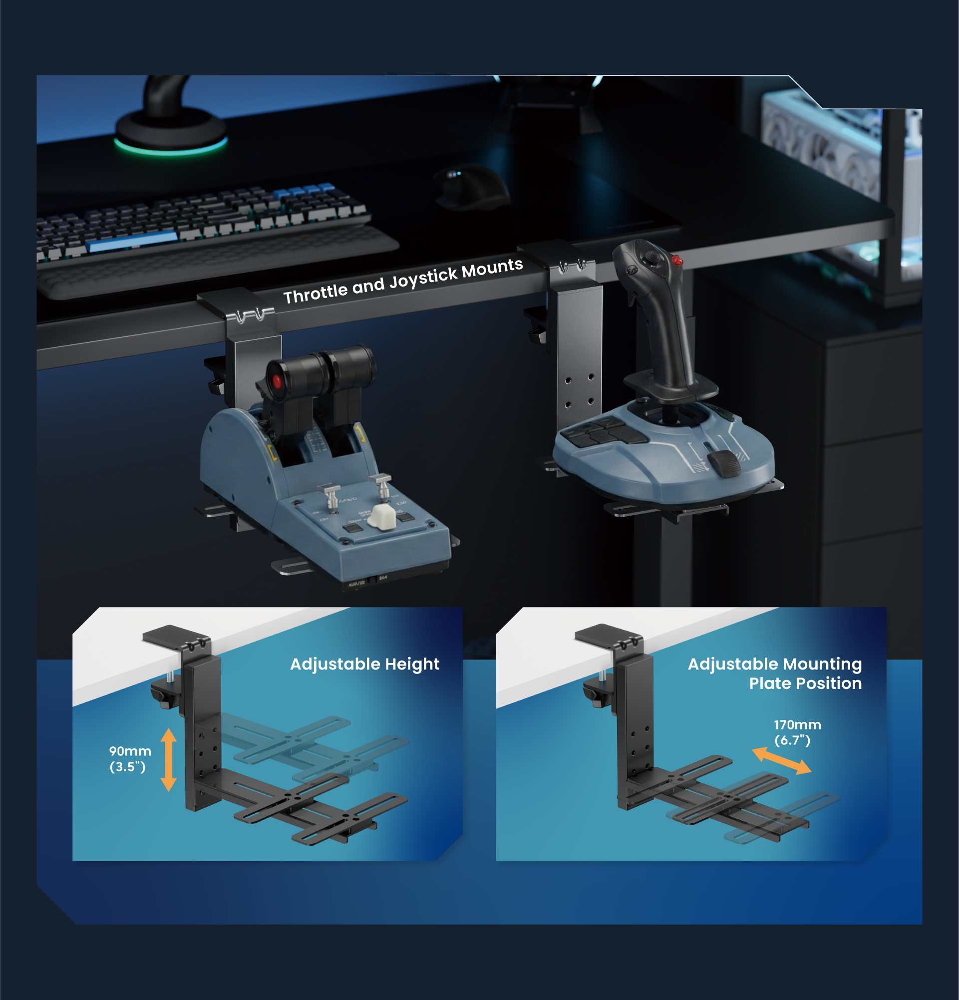Being a purpose-built for flight simulation setups, the LRA04-BS02 includes throttle and joystick mounts with adjustable heights and mounting plate positions. Fitting gears from most popular brands, the LRA04-BS02 combines universal compatibility with user-friendly adjustability—offering a solid, customizable cockpit foundation for immersive flight experiences.