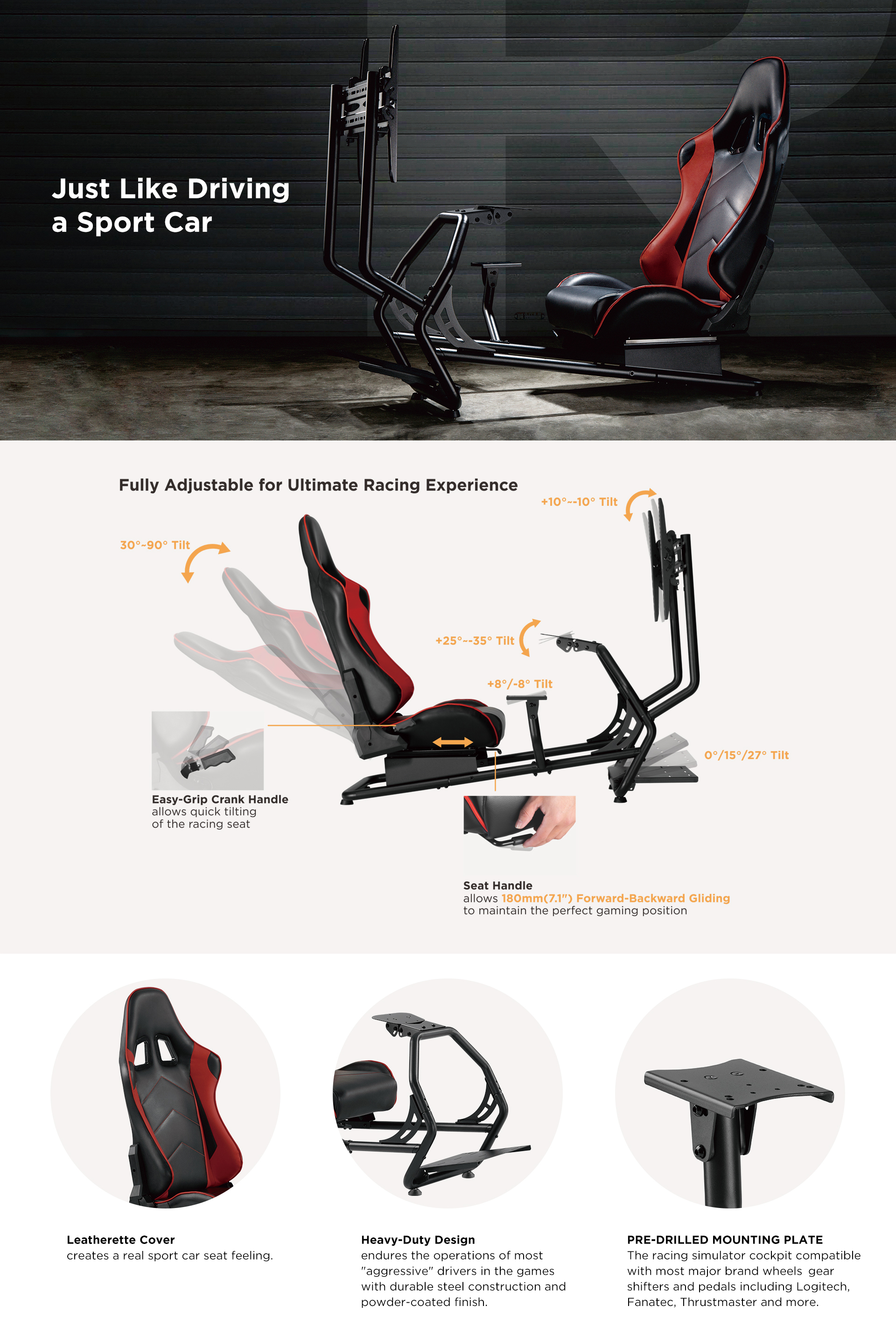 The pre-drilled mounting points provide compatibility with most major wheel and pedal brands including: Logitech, Fanatec, Thrustmaster and more. The comfortable reclining seat offers smooth forward and back glide of 180mm (7.1″) providing ample legroom. An easy-grip crank handle allows the seat to be adjusted from 30° to 90° for the best driving position. The gear shifter mount can be used at both sides to fit for different driving habits. The pre-drilled mounting points contribute great compatibility with the most demanding gear shifters in the market including Logitech, Fanatec, Thrustmaster and more. The single monitor stand attached in front of the racing seat to fit for most 37"-55" screens is quite recommendable. Featuring two height settings and ±10° tilting adjustment, it provides the gamer with the most realistic racing views. Pick up the cockpit and customize it with your own graphics now!